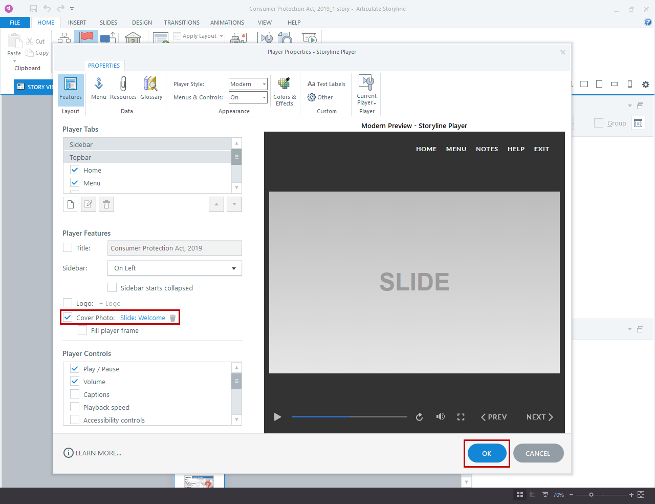 Open the Articulate Storyline 360 project and click the Player tab on the ribbon.