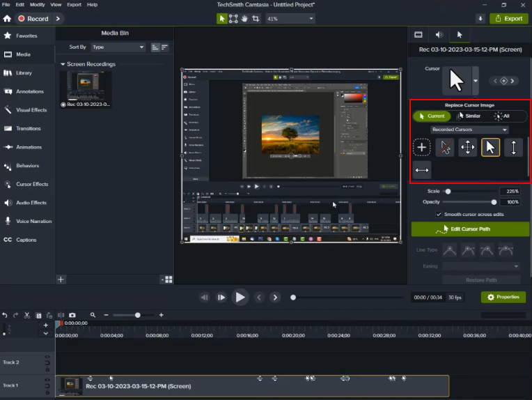 Launch the ‘Camtasia’ software, record a video using Camtasia, and import it into the media bin to change the cursor.