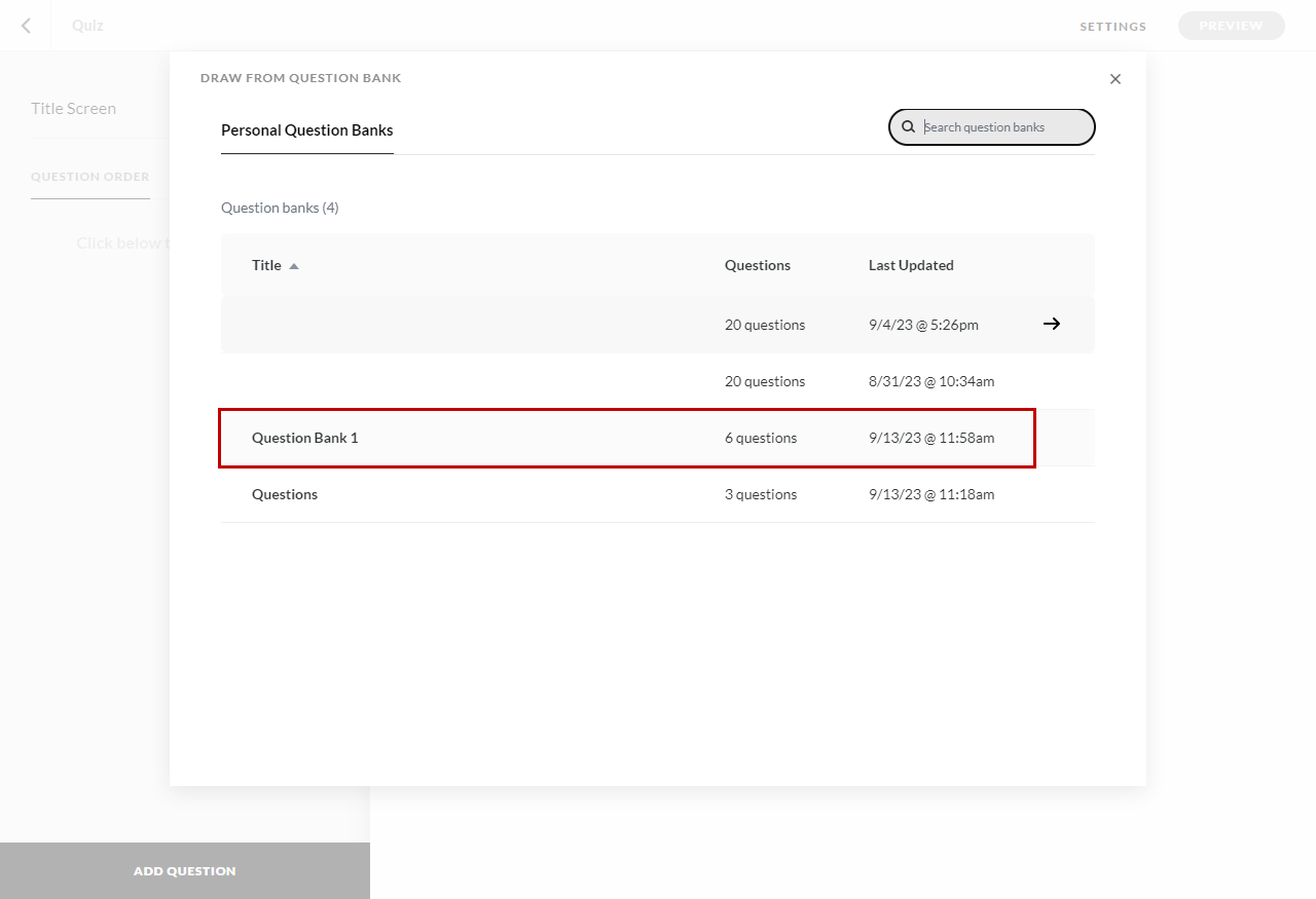 Click the “Add Question” button at the bottom left and select a “Draw from Question Bank”.