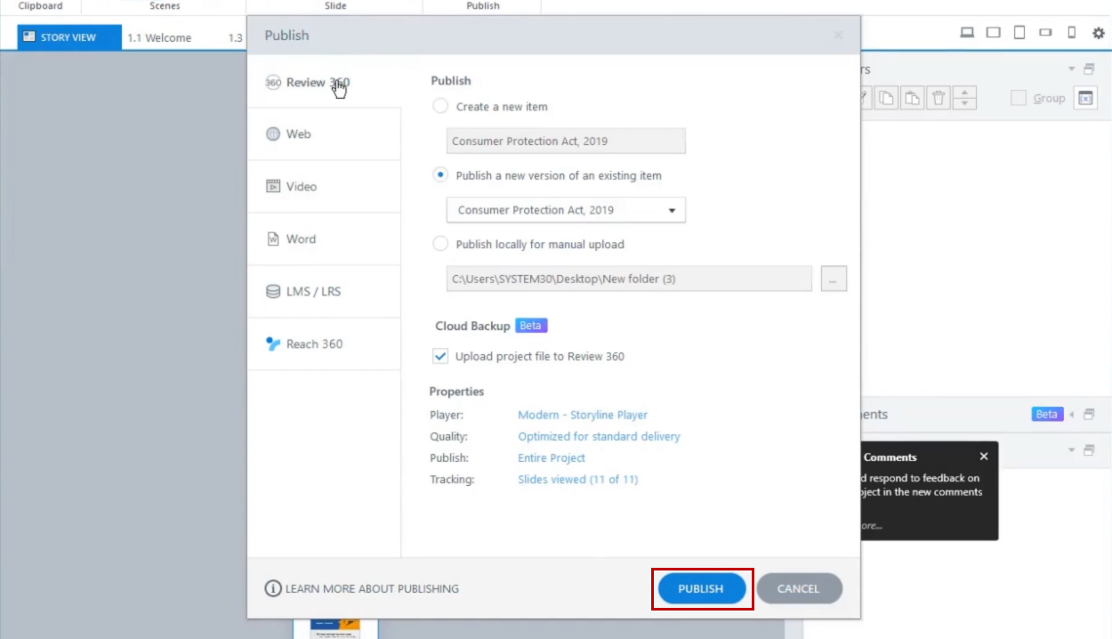 After making all the necessary changes, tick the ‘Upload project file to Review 360’ checkbox, and proceed to click the ‘Publish’ button.