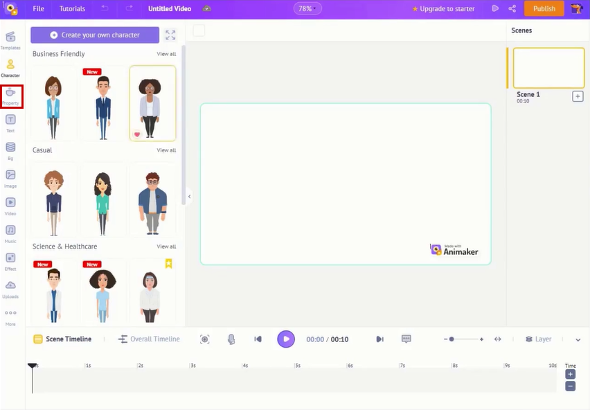 To add frames to the video, click the ‘property’ icon on the left-side panel.